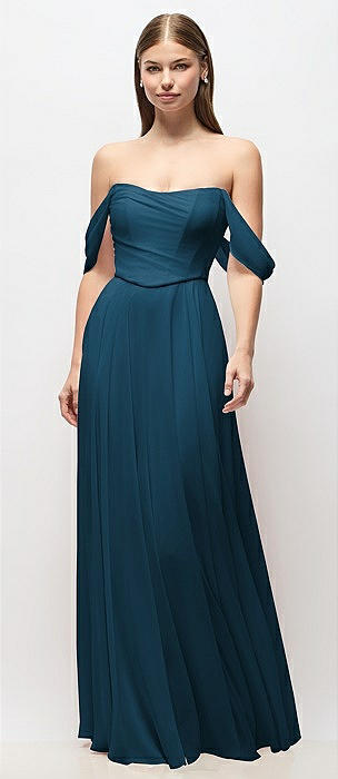 Off-the-Shoulder Basque Corset Chiffon Maxi Dress in atlantic blue