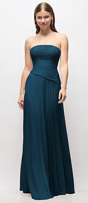 Strapless Chiffon Maxi Dress with Asymmetrical Ruched Drop Waist in atlantic blue