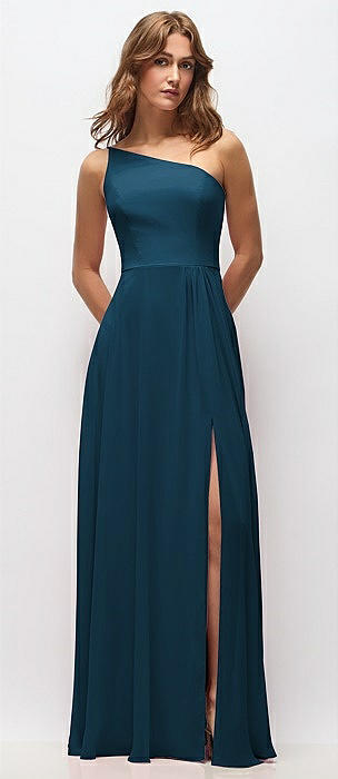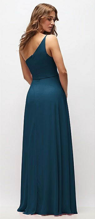 One-Shoulder Chiffon Maxi Dress with Shirred Front Slit in atlantic blue