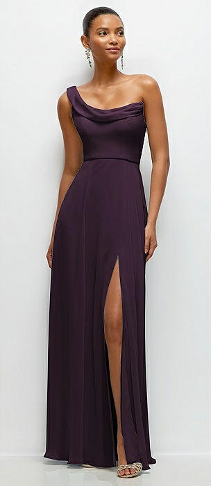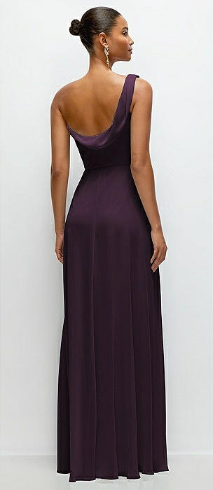 Chiffon One-Shoulder Maxi Dress with Draped Cowl Neckline in aubergine