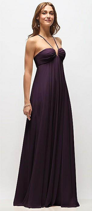 Shirred Halter Chiffon Maxi Dress with Back Sash-Tie Closure in aubergine