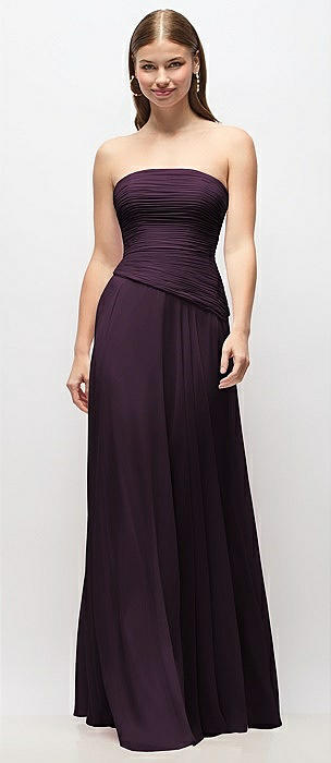 Strapless Chiffon Maxi Dress with Asymmetrical Ruched Drop Waist in aubergine