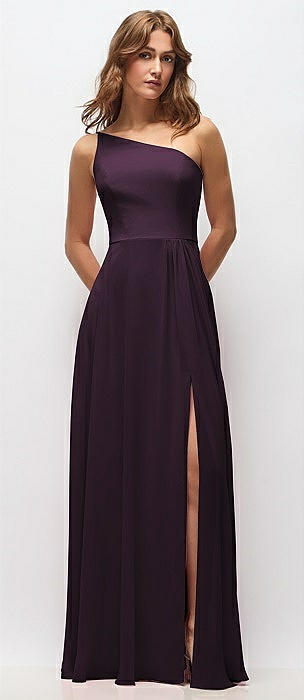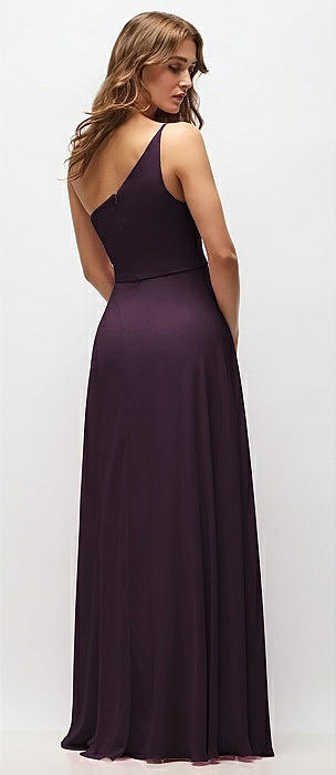 One-Shoulder Chiffon Maxi Dress with Shirred Front Slit in aubergine