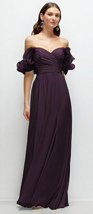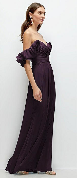 Off-the-Shoulder Basque Neck Maxi Dress with Flounce Sleeves in aubergine