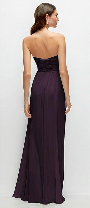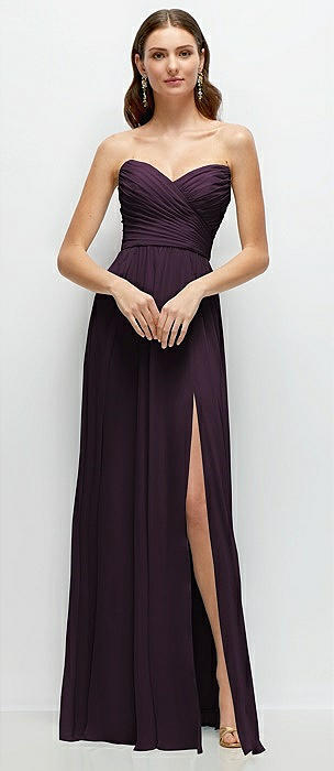 Strapless Pleated Surplice Chiffon Maxi Dress with A-Line Skirt in aubergine