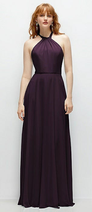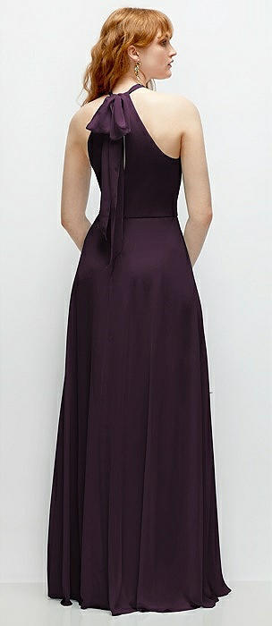 Shirred Halter Chiffon Maxi Dress with Back Sash-Tie Closure in aubergine
