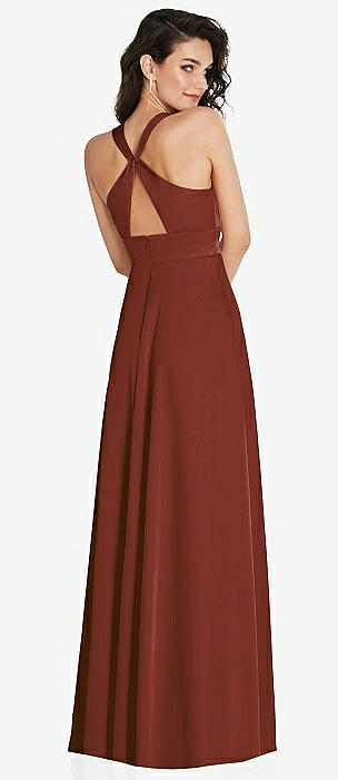 Shirred Shoulder Criss Cross Back Maxi Dress with Front Slit in auburn moon