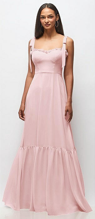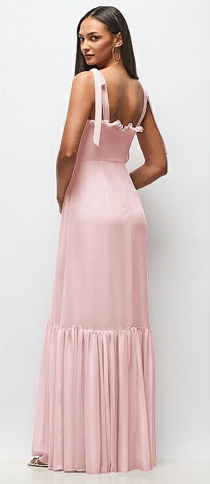 Tie-Shoulder Bustier Bodice Ruffle-Hem Maxi Dress in ballet pink