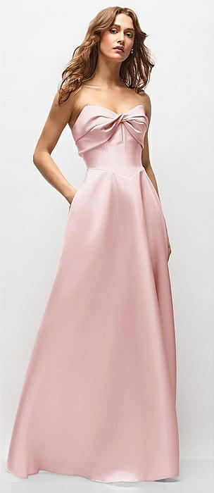 Strapless Pleated Draped Satin Mini Dress with Dramatic Long Tail Bow & Covered Buttons in ballet pink