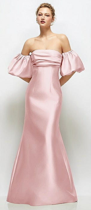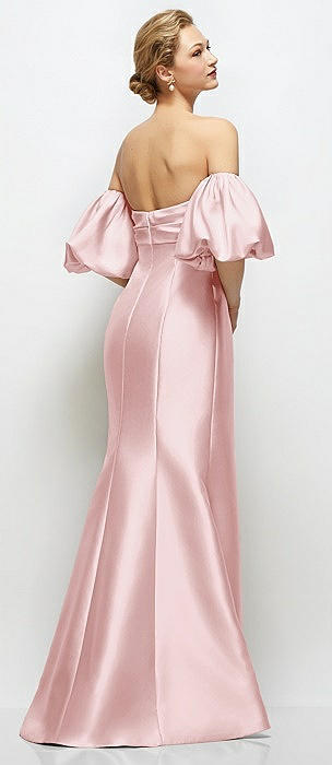 Off-the-Shoulder Puff Sleeve Satin Maxi Dress with Flared Skirt in ballet pink