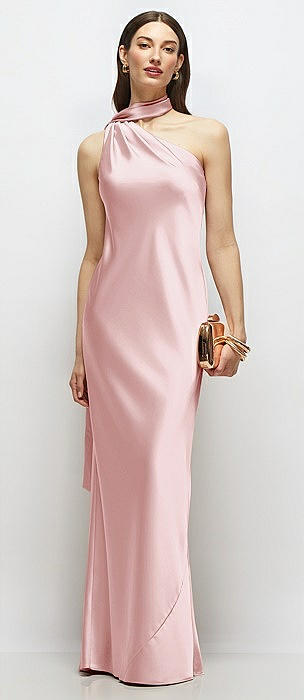 Draped Scarf One-Shoulder Bias Stretch Satin Maxi Dress in ballet pink