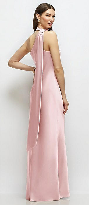 Band Collar Halter Open Back Fluid Satin Maxi Dress with Self-Tie Bow in ballet pink