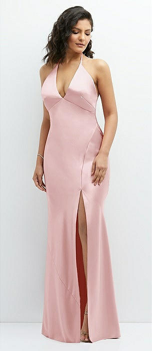 Plunge Halter Open-Back Maxi Bias Dress with Low Tie Back in ballet pink