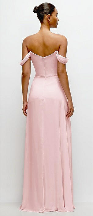 Bow-Shoulder V-Back Chiffon Gown with Front Slit in ballet pink