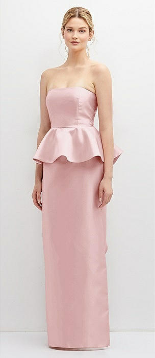 Strapless Satin Maxi Dress with Cascade Ruffle Peplum Detail in ballet pink