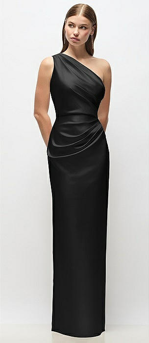 One-Shoulder Draped Bodice Stretch Satin Column Maxi Dress in black