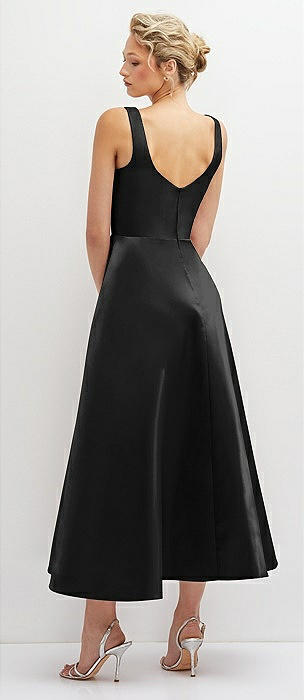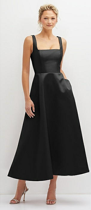 Square Neck Satin Midi Dress with Full Skirt & Pockets in black