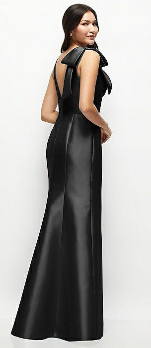 Deep V-back Satin Trumpet Dress with Cascading Bow at One Shoulder in black