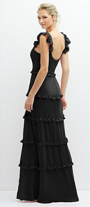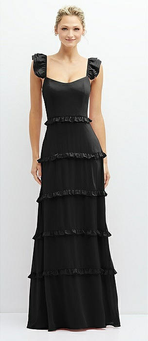 Tiered Chiffon Maxi A-line Dress with Convertible Ruffle Straps in black