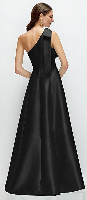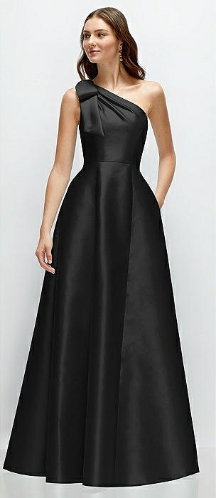 Bow One-Shoulder Full A-Line Satin Maxi Dress in black