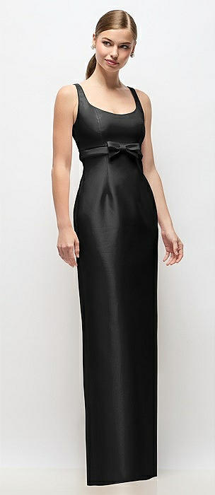 Scoop Neck Satin Column Maxi Dress with Bow at Empire Waist in black