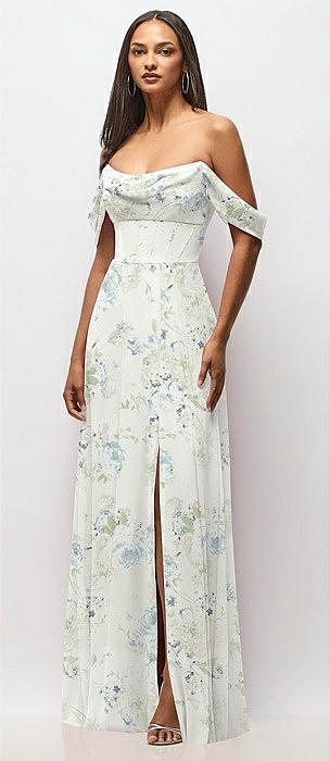 Chiffon Corset Maxi Dress with Removable Off-the-Shoulder Swags in bleu garden