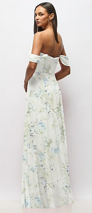 Off-the-Shoulder Basque Corset Floral Chiffon Maxi Dress in bleu garden