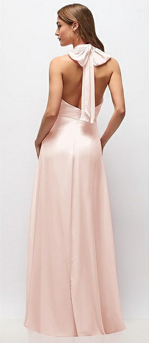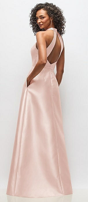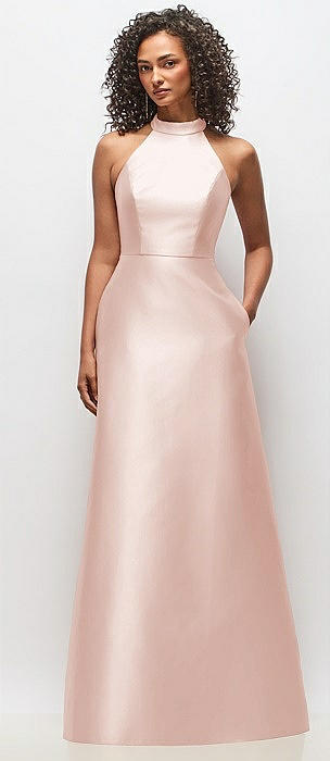 High-Neck Halter Open-Back Satin Trumpet Dress in blush