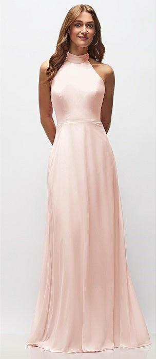 High-Neck Halter Chiffon Maxi Dress with Adjustable Spaghetti Straps in blush