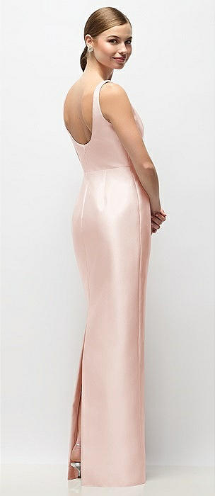 Basque-Neck Satin Column Maxi Dress with Off-the-Shoulder Bows in blush