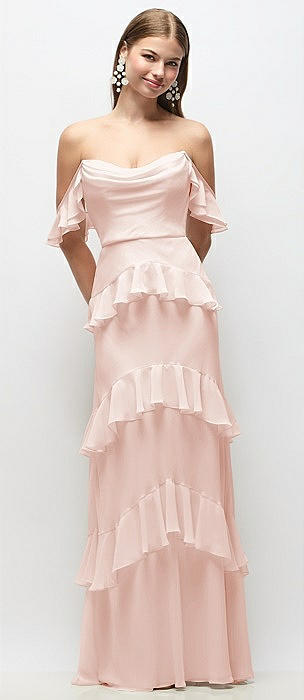 Off-the-Shoulder Cowl Chiffon Tiered Ruffle Maxi Dress with Convertible Ruffle Straps in blush