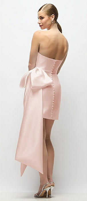 Strapless Pleated Draped Satin Mini Dress with Dramatic Long Tail Bow & Covered Buttons in blush