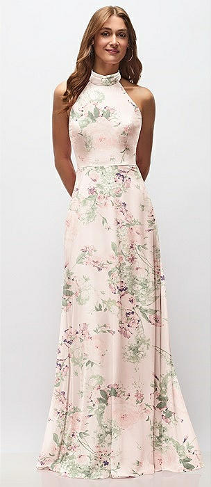 High-Neck Halter Floral Chiffon Maxi Dress with Adjustable Spaghetti Straps in blush garden