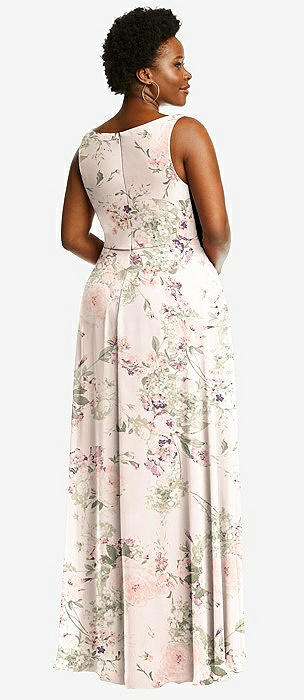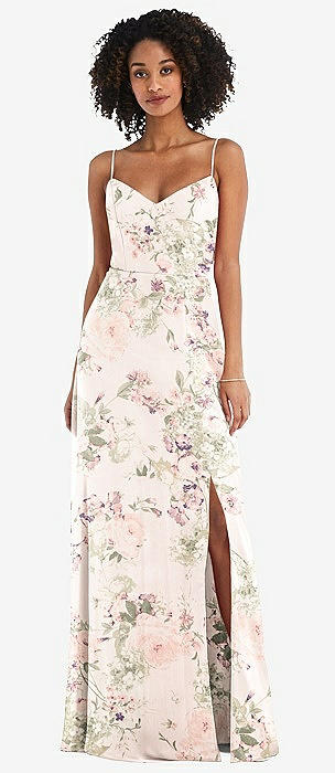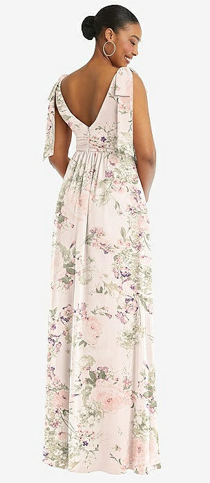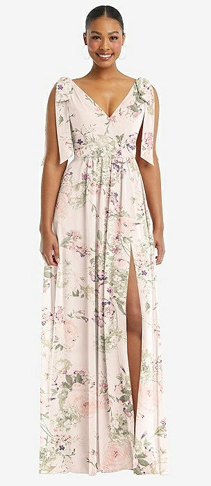 Plunge Neckline Bow Shoulder Empire Waist Chiffon Maxi Dress in blush garden