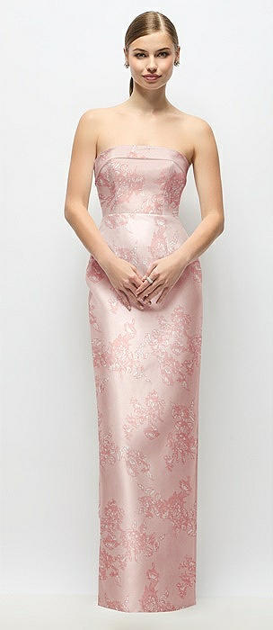 Strapless Floral Satin Column Dress with Back Slit in bow and blossom print