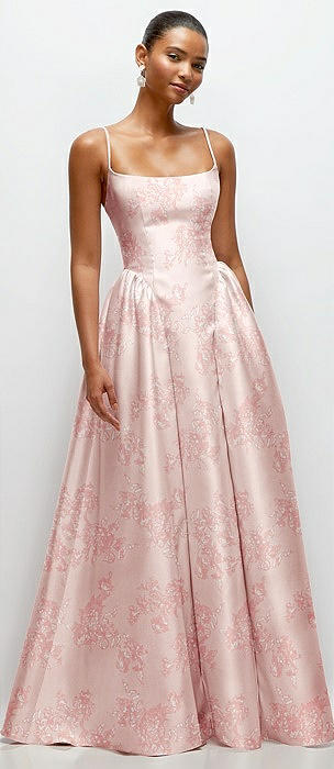 Floral Strapless Satin Drop Waist Gown with Full Skirt in bow and blossom print