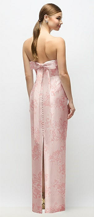 Strapless Floral Satin Column Dress with Back Slit in bow and blossom print