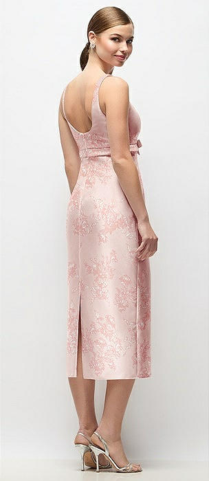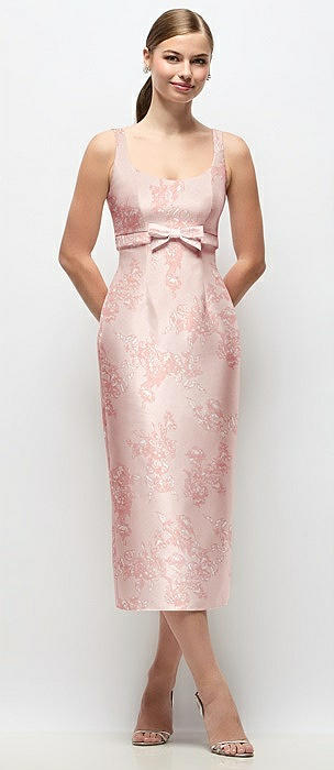 Scoop Neck Floral Satin Column Midi Dress with Bow at Empire Waist in bow and blossom print