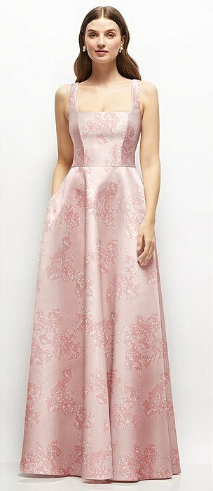 Floral Square-Neck Satin Maxi Dress with Full Skirt in bow and blossom print