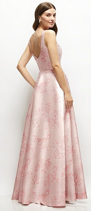 Strapless Bias Cuff Bodice Floral Satin Gown with Pockets in bow and blossom print