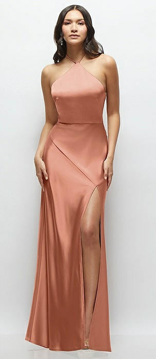 High-Neck Halter Stretch Satin Maxi Dress with Bias A-line Skirt in copper penny
