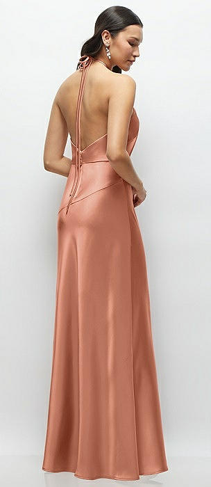 Plunge Halter Open-Back Maxi Bias Dress with Low Tie Back in copper penny