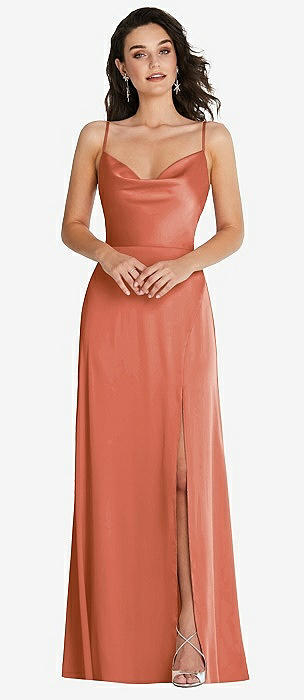 Soft Cowl Neck Ruched Side Satin Bias Maxi Dress with Shoulder Bows in terracotta copper