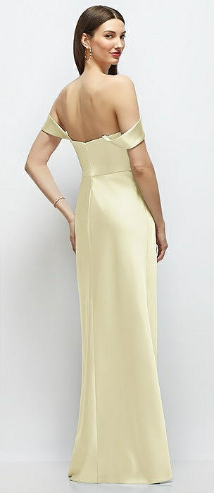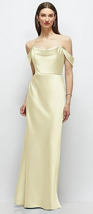 Basque-Neck A-Line Stretch Satin Maxi Dress with Off-the-Shoulder Drape in butter yellow