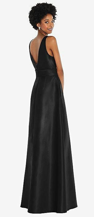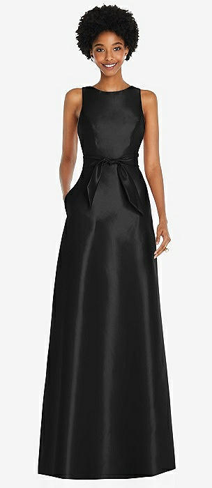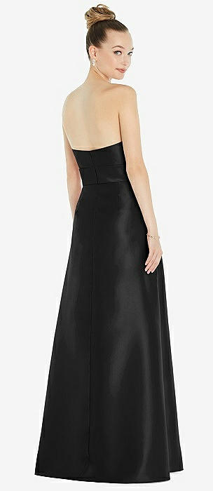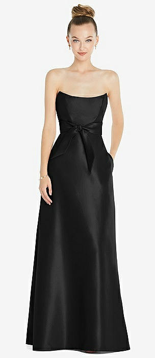 Basque-Neck Strapless Satin Gown with Mini Sash in black