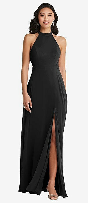 Shirred Skirt Jewel Neck Halter Dress with Front Slit in black