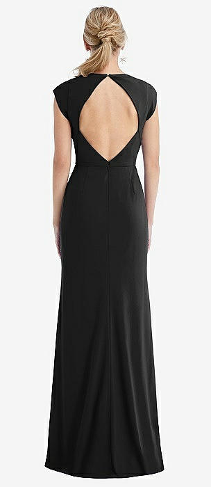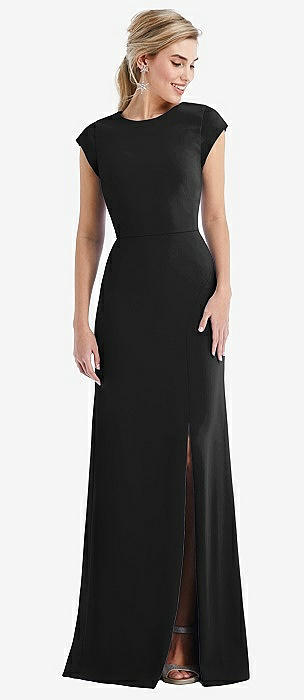 Cap Sleeve Open-Back Trumpet Gown with Front Slit in black