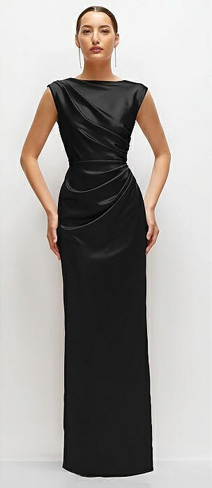 Bateau Neck Satin Column Dress with Bow-Trimmed Skinny Belt in black