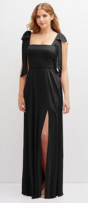 Bow Shoulder Square Neck Chiffon Maxi Dress in black