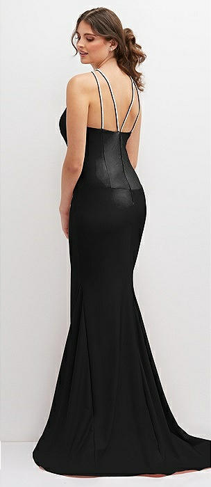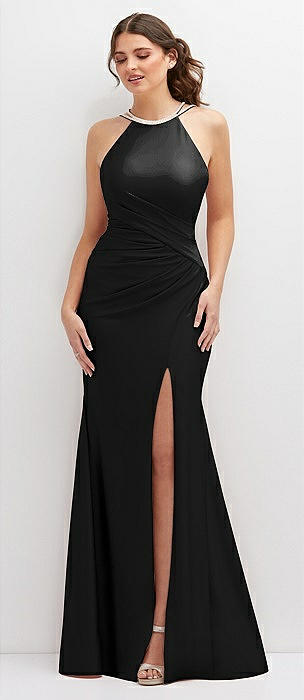 Halter Asymmetrical Draped Stretch Satin Mermaid Dress with Rhinestone Straps in black